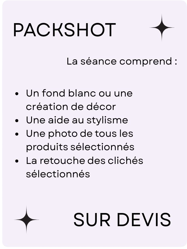 Un packshot sert à présenter clairement et nettement votre produit. Il peut être classique et se réaliser sur fond blanc ou neutre, afin d’être utilisé pour le e-commerce ou les catalogues.