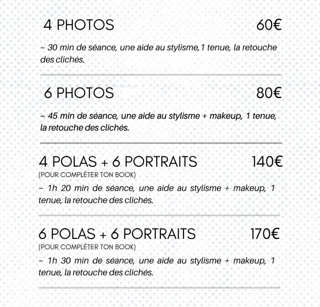 - Après nous être entendu.e.s sur les différentes modalités, notamment artistiques, (surtout si vous avez choisi la séance portrait car les polas répondent généralement aux mêmes critères techniques et artistiques) nous fixons une date pour notre shooting.
